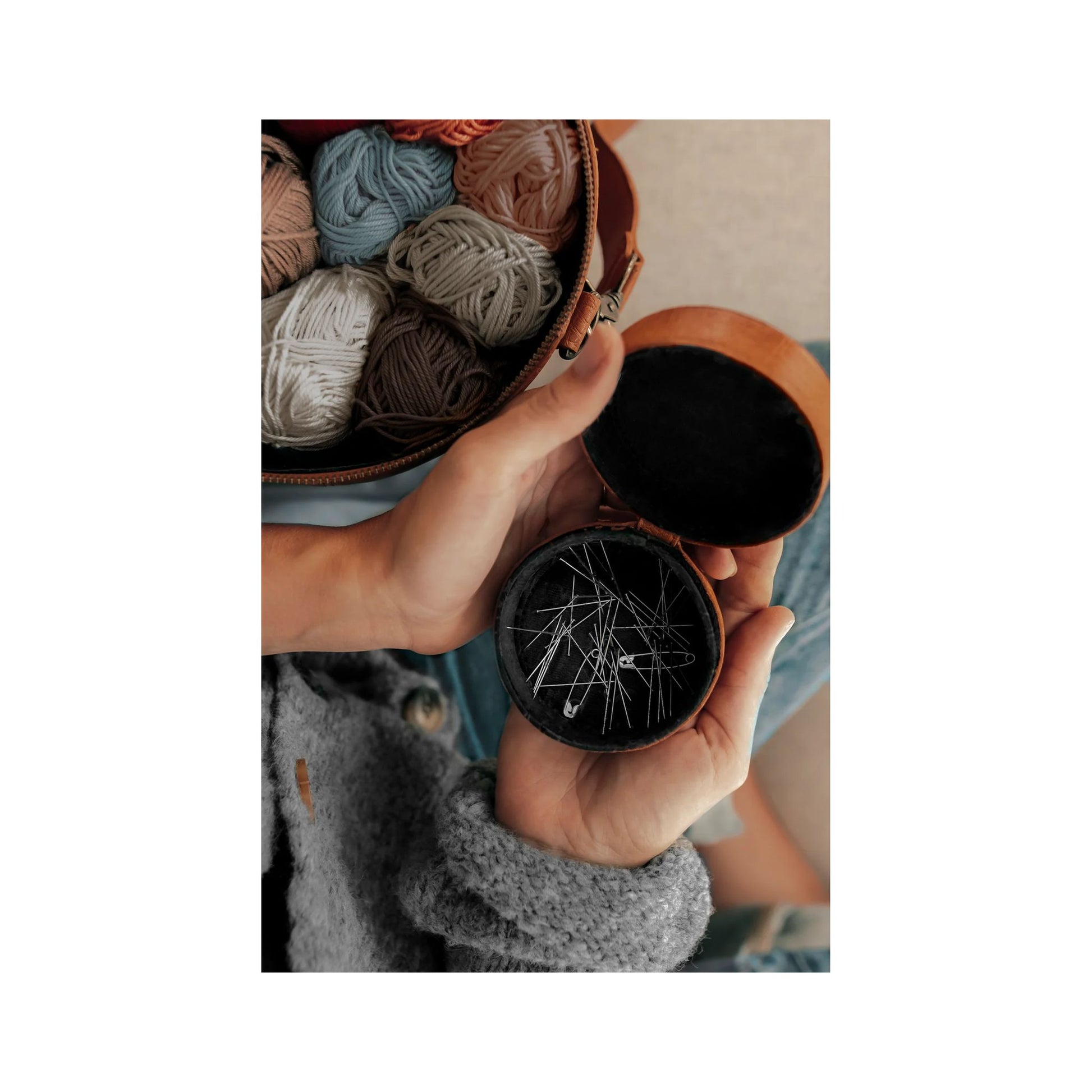 「ムー エメリ」は、卓越した美しさと機能性を兼ね備えた小さな円形レザーケースです。磁石付きの底部により、針や指ぬき、ビーズなど、失われやすい小物をしっかりと固定します。手触りの良い本革製で、洗練されたデザインはあなたの手仕事に優雅さを添えます。